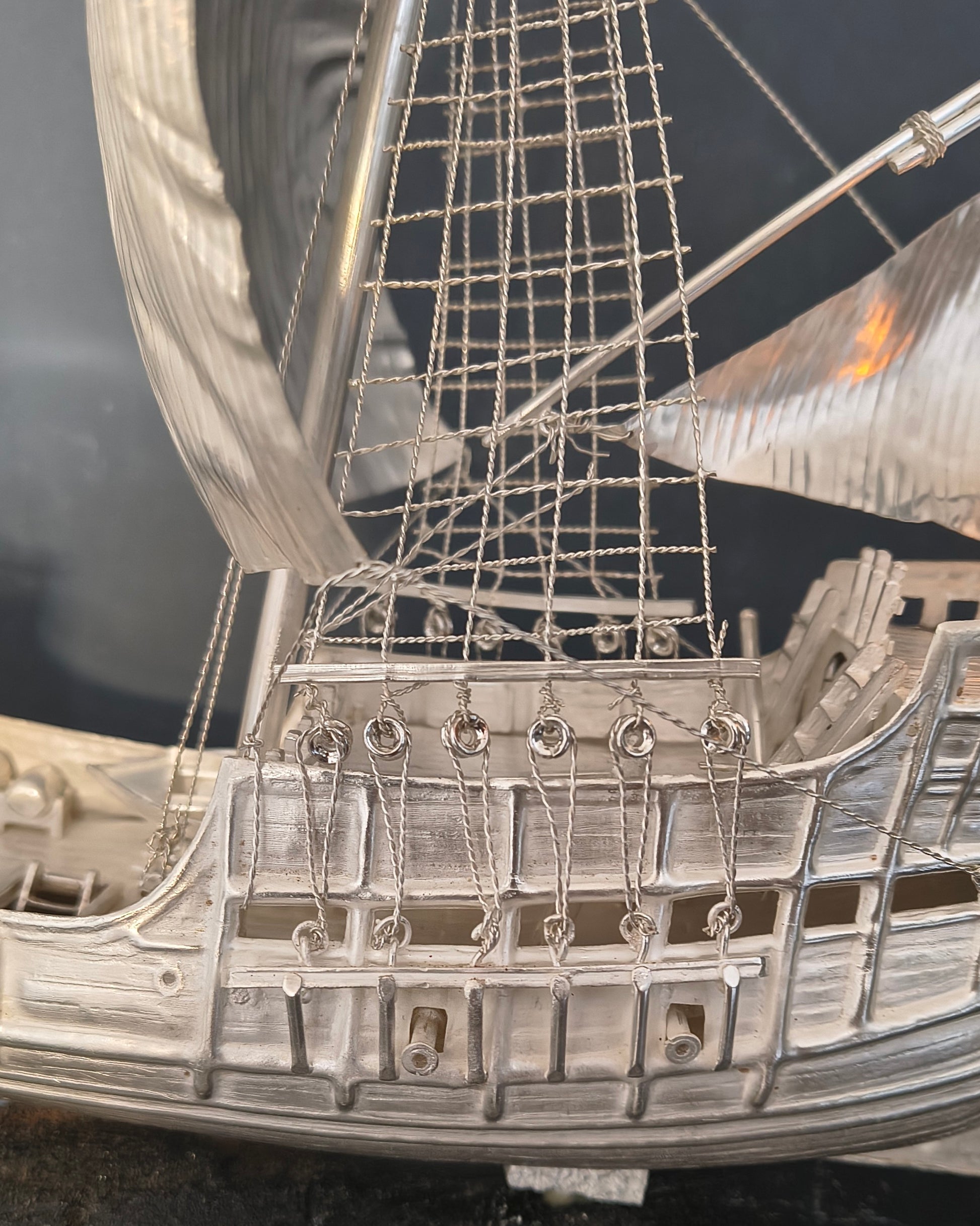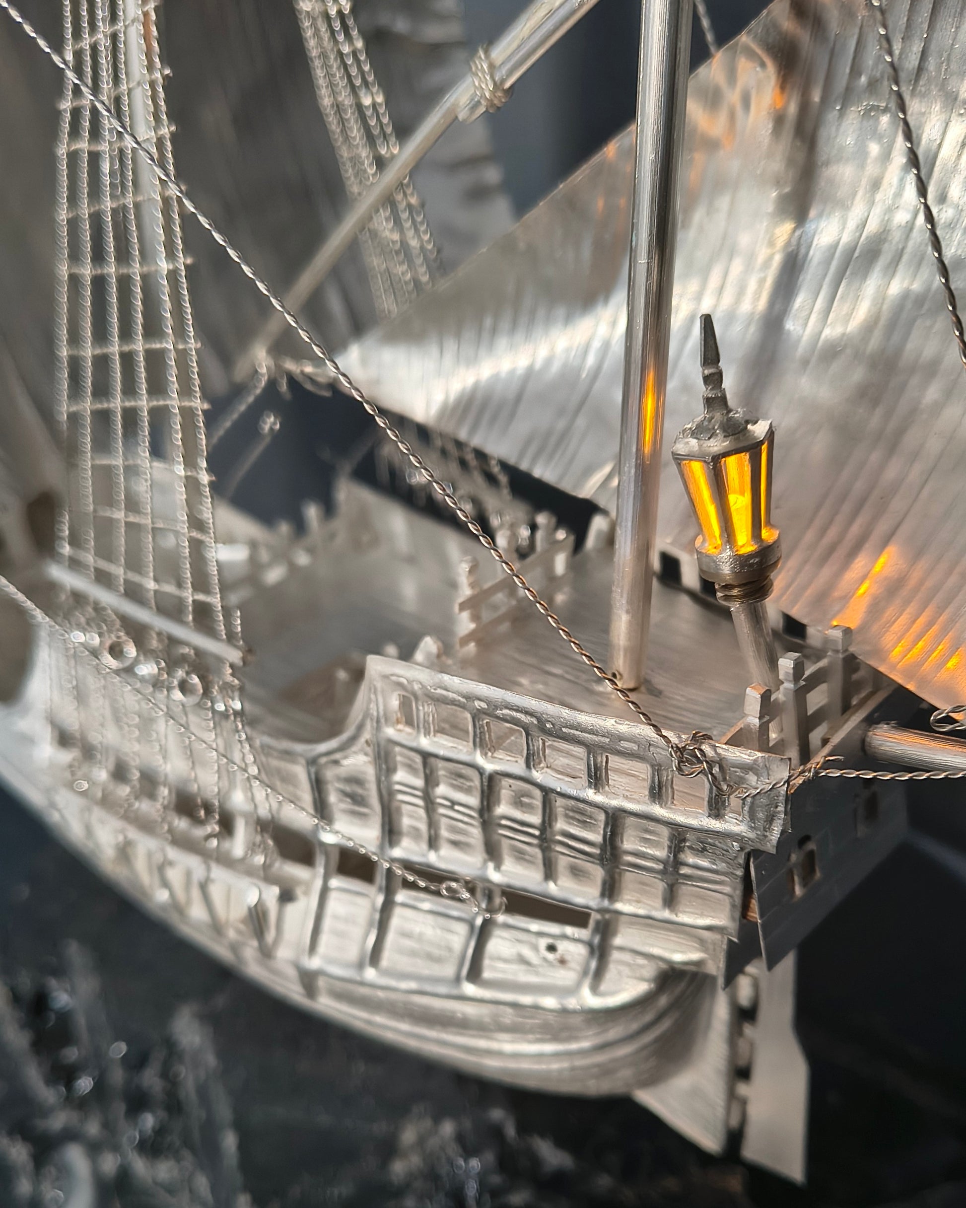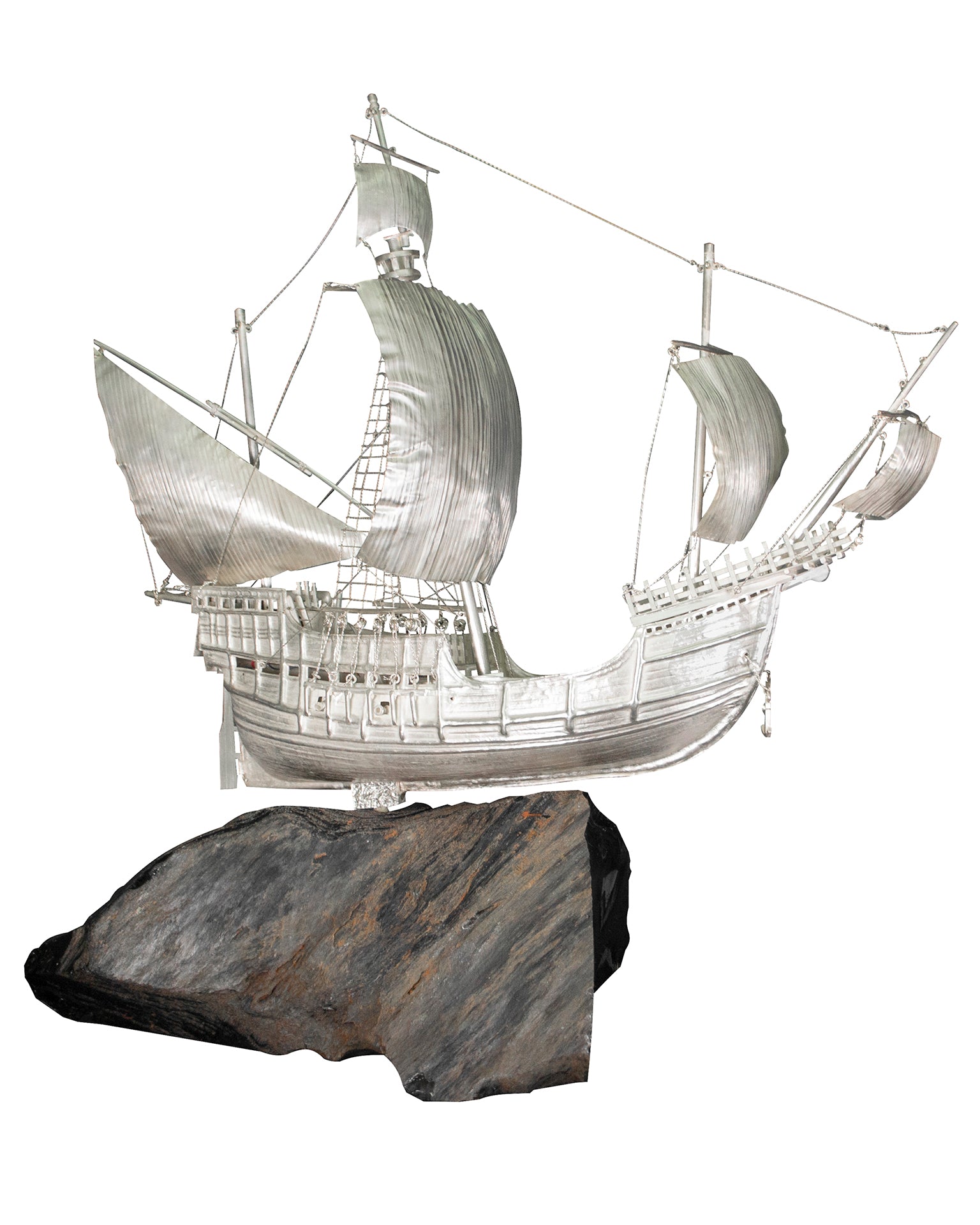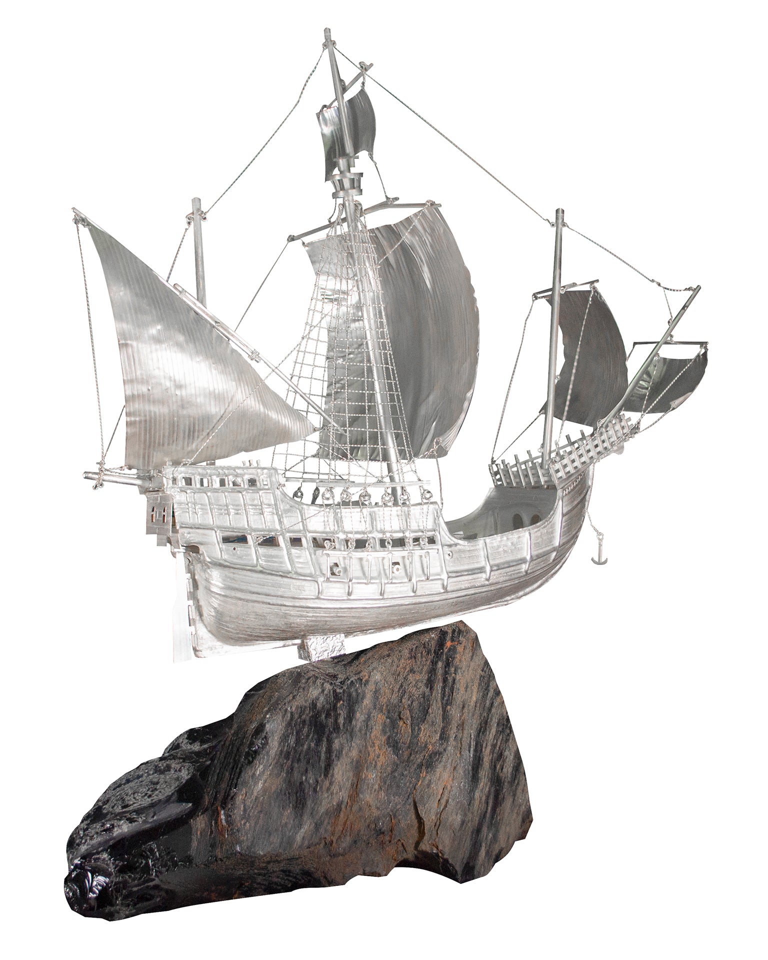 La pieza "Abismo" es una escultura que evoca a la meditación sobre el eterno conflicto y triunfo del espíritu humano, buscando capturar un momento de dinamismo sereno que desafía la estabilidad. La embarcación forjada en plata emerge de forma inclinada como si estuviera naciendo del basalto primordial.