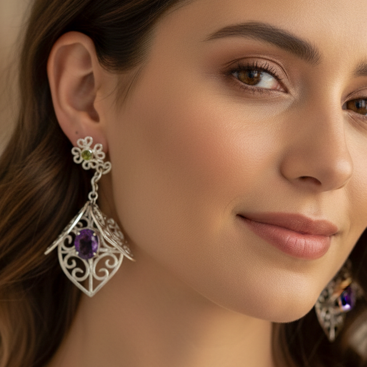 Inspirados en la herrería artística de Taxco, los contornos de los pétalos muestran un trabajo detallado de forja, mientras que una amatista morada en el centro de cada flor evoca la intensidad del color de la bugambilia. La plata pulida refleja la luz como la mañana sobre las fachadas blancas del pueblo, haciendo de estos aretes un accesorio único y significativo.